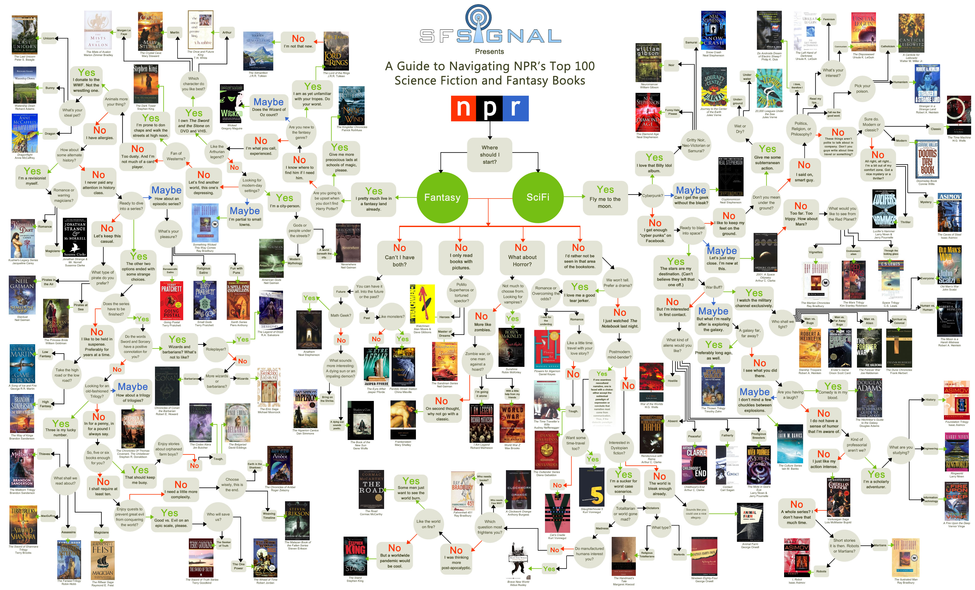 A few years ago, my friend James (aware of my interest in science fiction) sent me this flowchart based on the NPR’s Top 100 Sci-Fi and Fantasy books.